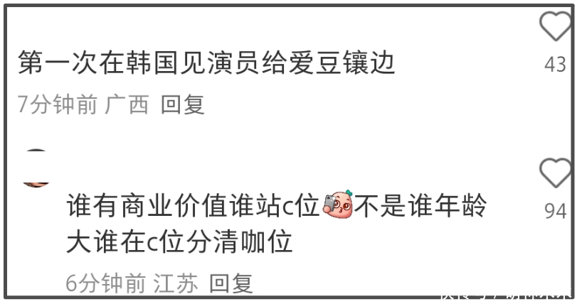 看到全智贤的站位,有网友表示第一次看到韩国演员给爱豆镶边,似乎是为其鸣不平,但并没有获得太多赞同声,直接被怼“谁商业价值大谁C位,并不是谁年龄大谁C分清咖位”,言语中充斥着对全智贤的不屑,由此可见全智贤的路人缘有多差。